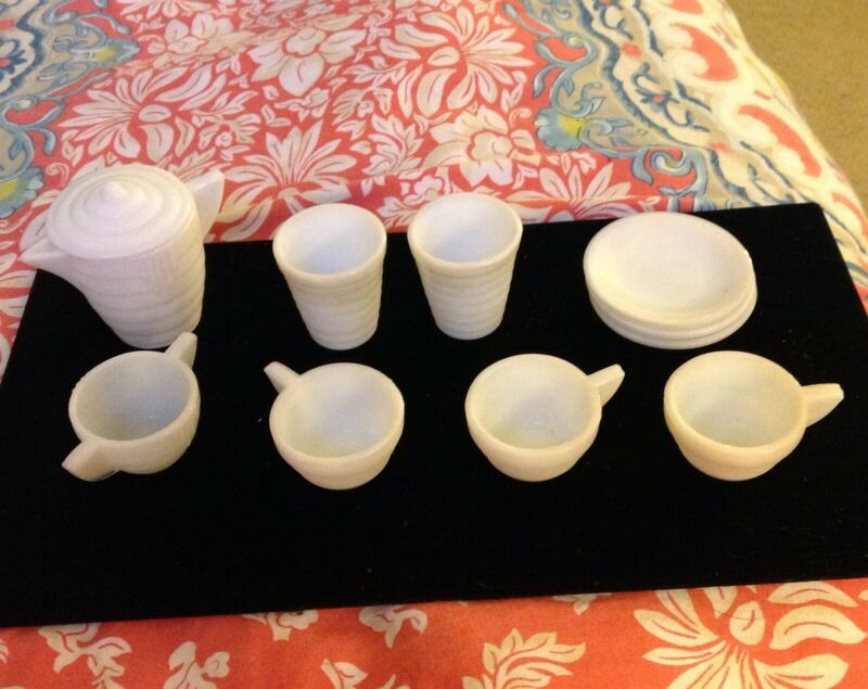 Title (ebay affiliate link): VINTAGE MILK GLASS WHITE MINIATURE SET OF 10 PIECES TEA SET -