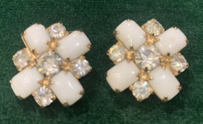 Title (ebay affiliate link): Vintage Gold Tone White Milk Glass & Rhinestones Flower Clip On Earrings