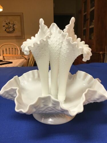 Title (ebay affiliate link): Fenton Art Glass Milk Glass Hobnail Diamond Lace 3 Horn Epergne