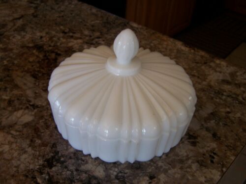 Title (ebay affiliate link): Anchor Hocking Old Cafe White Milk Glass Covered Candy Dish Ribbed Lid