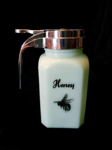 Title (ebay affiliate link): JADITE JADE JADEITE GREEN MILK Glass HONEY BEE SYRUP PITCHER DISPENSER