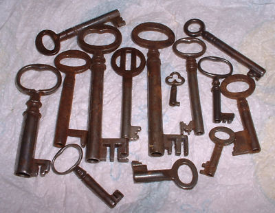 FOURTEEN ANTIQUE KEYS - LOCKS / CLOCK / BOXES