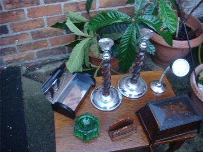 antique old vintage candle sticks clock, ashtray box