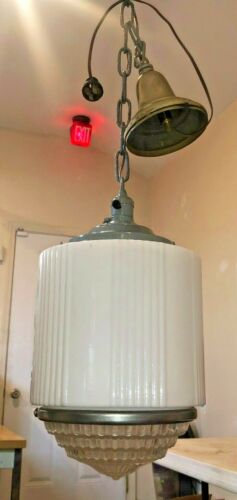 Art-Deco 1930''s Skyscraper Hanging Lamp Milk Glass / Crystal Pendant WORKING!