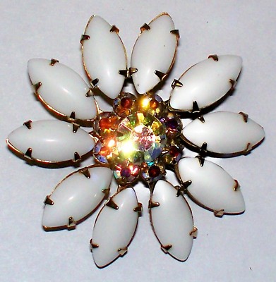 Vintage Milk Glass And AB Rhinestone Pin Brooch