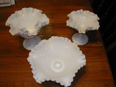 2 Fenton Milk Glass Hobnail Compotes & 1 Flower Bowl