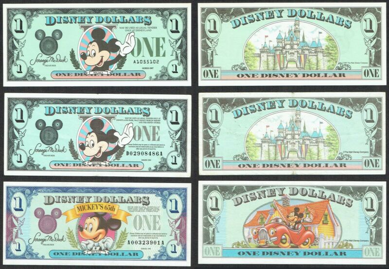 Disney Dollars 3x One 1 Dollar 1987 1990 1993 Mickey