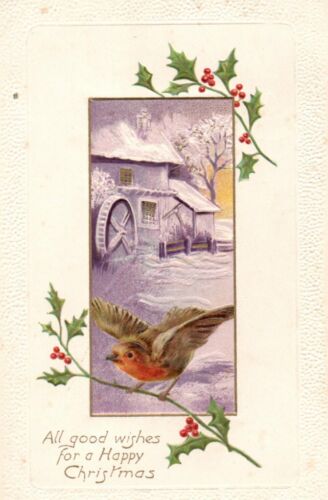 VINTAGE CHRISTMAS GREETING postcard: SNOW SCENE WITH ROBIN BIRD 1911
