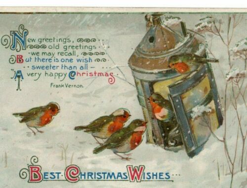 VINTAGE CHRISTMAS GREETING postcard: ROBIN BIRDS & LANTERN IN THE SNOW
