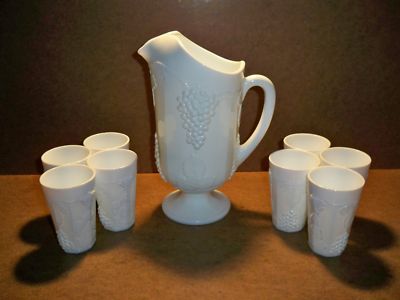 9pc WHITE MILK GLASS WATER PITCHER CUP SET GRAPE DESIGN