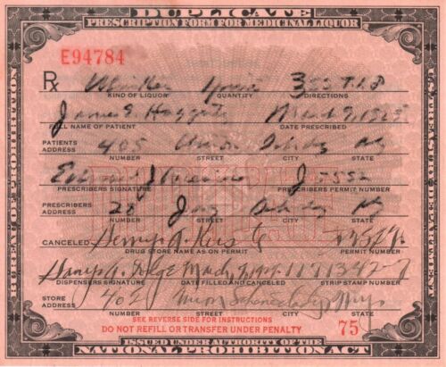 Title (ebay affiliate link): Prohibition Prescription 1929 Whiskey Vintage Pharmacy Doctor Bar Schenectady NY