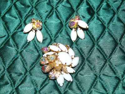 Weiss signed Milkglass & AB rhinestone Brooch/Earrings