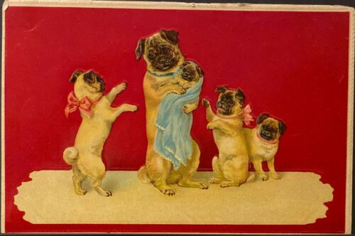 Title (ebay affiliate link): Mother Pug Dog Shows Baby Brother to Sibling Pug Dogs ~ Fantasy Postcard