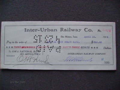 INTER-URBAN RAILWAY CO DES MOINES IOWA 1915 CHECK