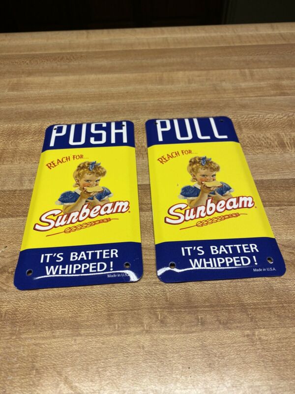 Set of 2 Vintage Sunbeam Bread Metal Advertising Door Push / Pull Signs Nice
