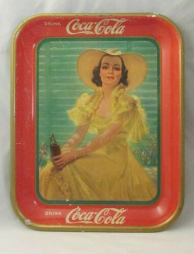 Antique Advertising Tin Coca Cola Coke Tray. 1938.Girl / Yellow Dress & Hat NR