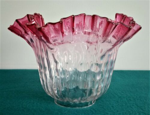 Lovely Vintage Clear Ribbed Glass & Flared Cranberry Rim Lamp Shade 7 cm fit dia