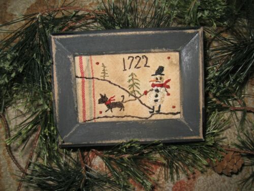 Primitive tiny Sampler~1722 Snowman Walking His Dog~Early Christmas~ Folk Art