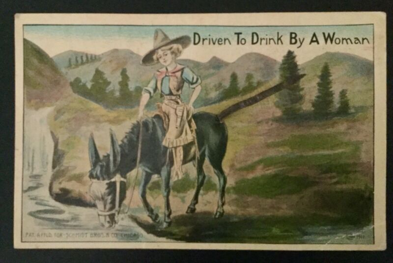 Title (ebay affiliate link): 1910 POSTCARD DRIVEN TO DRINK BY A WOMAN, DONKEY WITH REAL SPRING TAIL