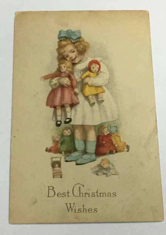 Best Christmas Wishes Little Girl Holding Baby Dolls Postcard Antique Vintage