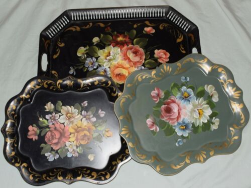Title (ebay affiliate link): 3-Art Gift Hand Painted Tole Toleware Tin Tray 18x24 15x19 Matching Black Green
