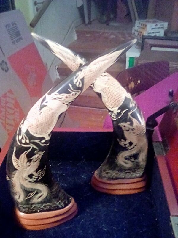 Title (ebay affiliate link): Beautiful Intricately carved horns. 13" tall.Oriental Phoenix motif.