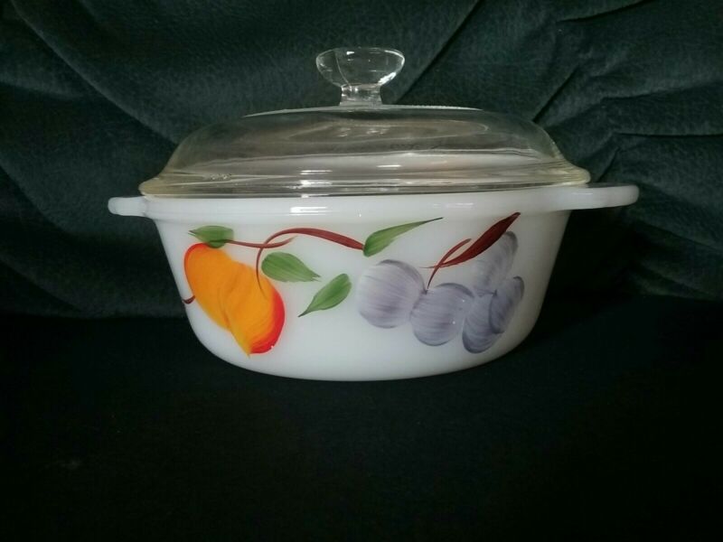 Fire King Gay Fad Milk glass 1 pt Casserole Dish with Lid Grapes Peach Nice!