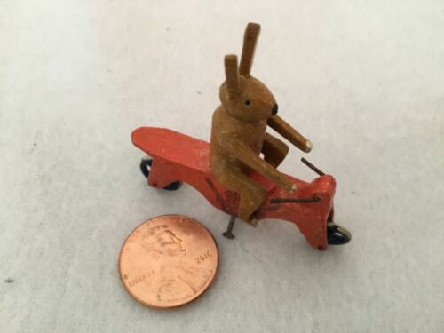 Miniature German Erzgebirge Carved Wood Rabbit On Motorcycle Penny Toy Putz