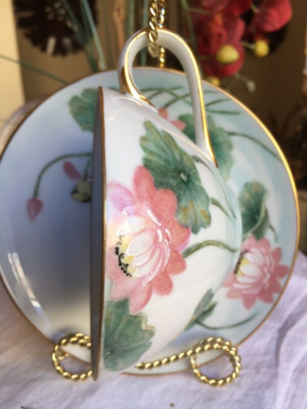 VINTAGE TEA CUP & SAUCER HAND PAINTED CORAL & GREEN FLOWERS