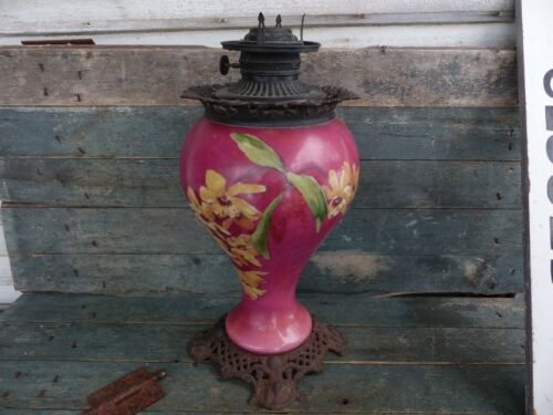 antique victorian painted glass parlor oil lamp w/ figural putti cast iron base