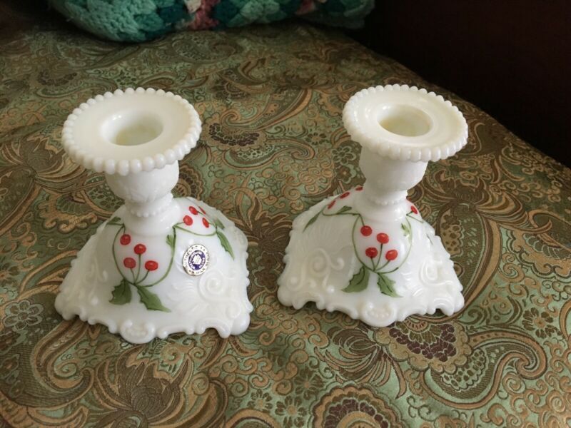 Vintage Westmoreland Milk Glass Christmas Candle Holders Hand Painted with Holly
