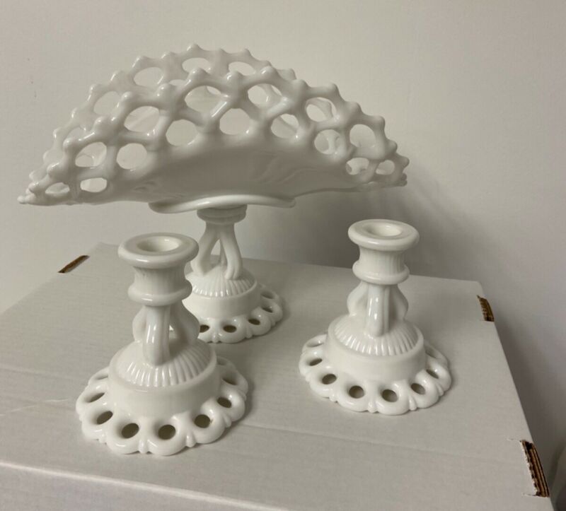 Title (ebay affiliate link): Antique WESTMORELAND Banana Fruit Bowl & Candle Sticks - Doric Lace Milk Glass