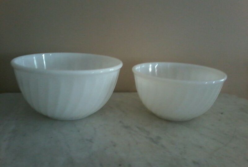 Title (ebay affiliate link): (2) Vtg Fire King Ovenware White Milk Glass Swirl Patt Mixing Nesting Bowls