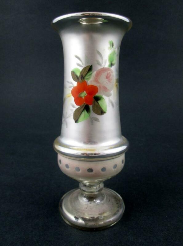 Antique MERCURY GLASS 6" tall VASE - Hand Painted Pink & Red FLOWERS - c.1880''s