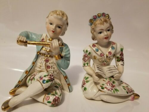 Vintage Pair Porcelain Ceramic Man & Woman Gold trim and Rinestones Seated Japan