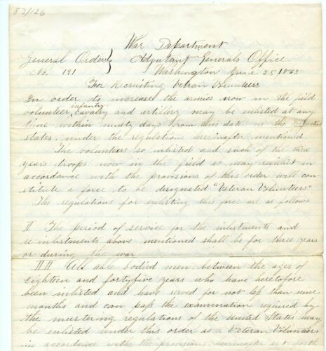 HandWritten Copy General Orders#191 Recruit Veteran Volunteers Pay $40 6.25,1863