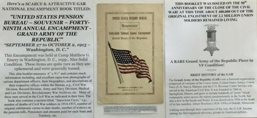 Title (ebay affiliate link): CIVIL WAR SOUVENIR 49th ANNUAL NATIONAL ENCAMPMENT GAR PENSION BUREAU BOOK 1915!