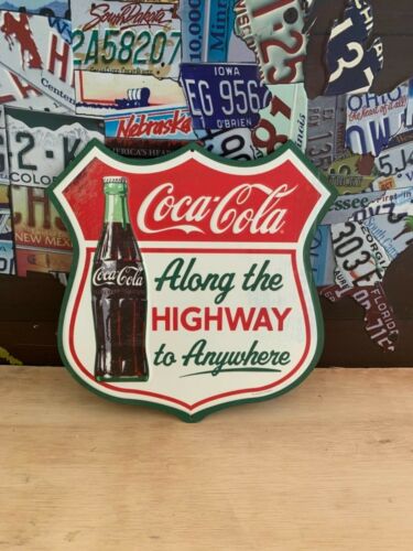 COCA COLA IN BOTTLE ALONG HIGHWAY HEAVILY EMBOSSED METAL SIGNN SALES SHOP NICE