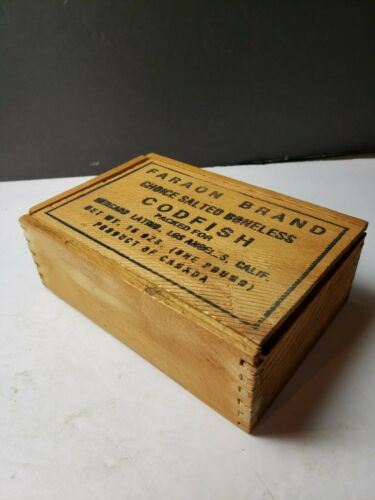 Title (ebay affiliate link): VINTAGE CANADA CODFISH WOODEN ADVERTISING BOX WITH DOVETAIL CORNERS