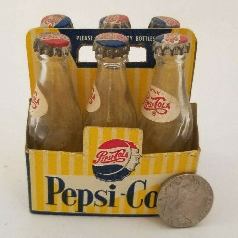 Title (ebay affiliate link): Vintage 6-Pack Miniature Glass Coke Clear Pepsi-Cola Bottles with metal top