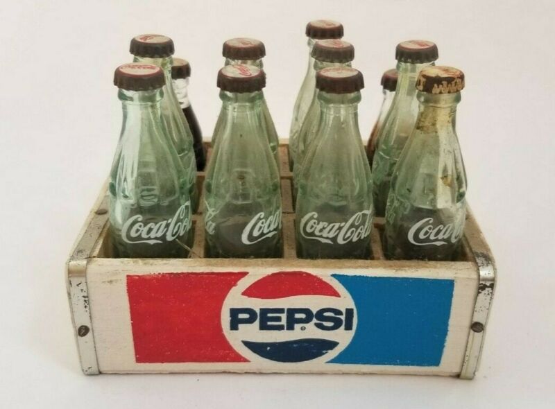 Title (ebay affiliate link): Set of 12 Miniature 3" Glass Coca Cola Bottles Pepsi Wood Crate Soda Pop