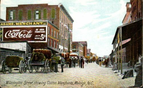 Title (ebay affiliate link): Antique Postcard Raleigh NC "Cotton Merchants" Wilmington Street Coca-Cola