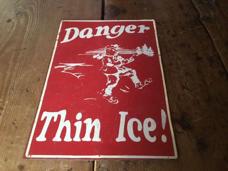 Title (ebay affiliate link): Danger Thin Ice 1950s Vintage Sign Skating Kid Playing Old Original Lake Warning