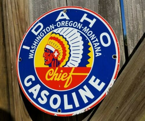 Title (ebay affiliate link): VINTAGE IDAHO GASOLINE PORCELAIN ENAMEL 1940 GAS PUMP AMERICAN INDIAN CHIEF SIGN