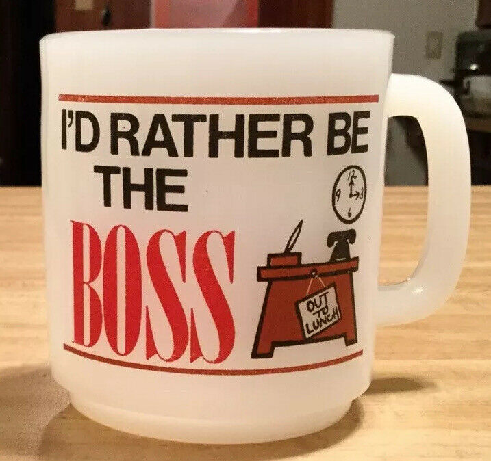 Title (ebay affiliate link): VINTAGE MUG WHITE MILK GLASS I''D RATHER BE THE BOSS GLASBAKE
