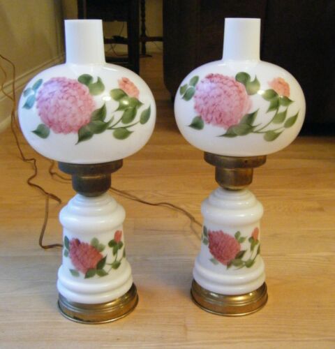 PAIR GONE WITH THE WIND VTG MILK-GLASS CHRYSANTHEMUM HURRICANE PARLOR LAMPS