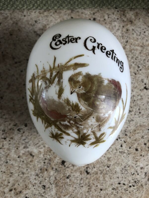 Antique Large Victorian Hand Blown Milk Glass Easter Egg Chick Easter Greeting