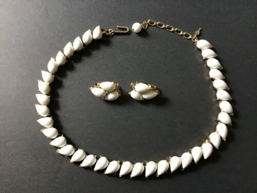 Title (ebay affiliate link): Vintage Crown Trifari Gold Tone Milk Glass Parure Necklace Earring Set