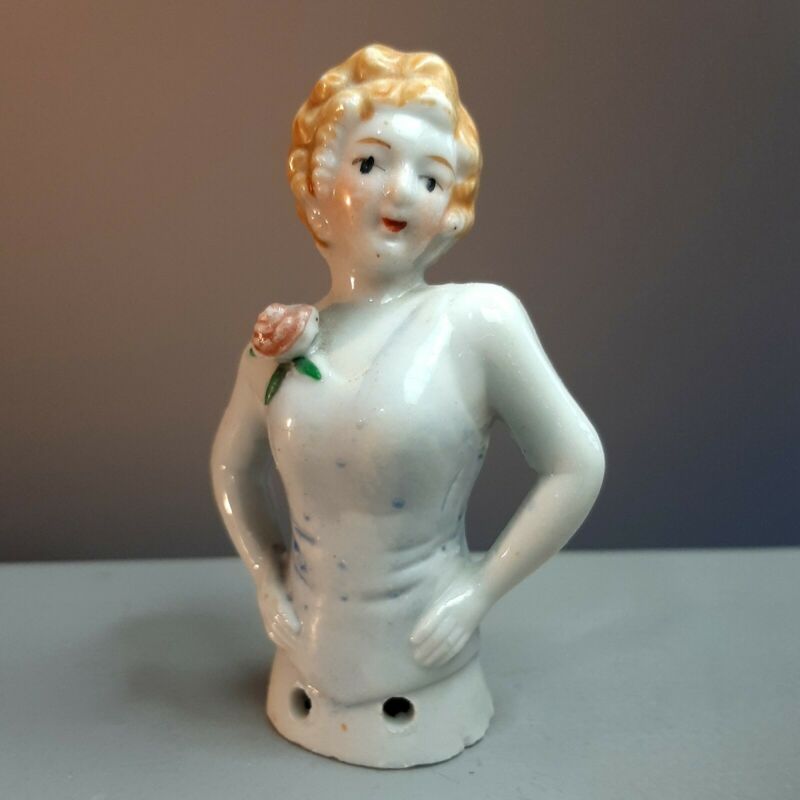 Title (ebay affiliate link): Antique 3.25" Porcelain Half Doll Bust Pin Cushion Lady Blonde Hair Vtg Japan