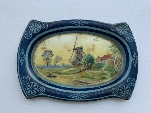 Title (ebay affiliate link): ANTIQUE MASCOT TOBACCO TIN LITHO TIP TRAY SIGN Depicting Windmill scene